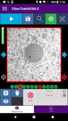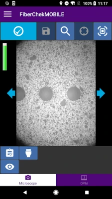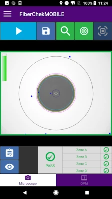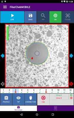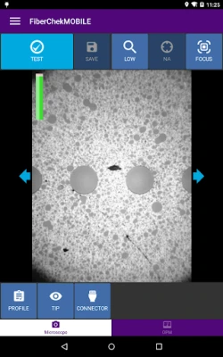 FiberChekMOBILE™ is the mobile version of the popular VIAVI FiberChekPRO™ software program to inspect, test, and certify fiber connectors in an optical network. FiberChekMOBILE works in conjunction with VIAVI test products such as the FiberChek™ Sidewinder™, FiberChek Probe, and P5000i digital analysis probe microscopes. Once connected, users can view live images of the fiber connector end face, focus the image, perform automated Pass/Fail analyses, generate certification reports, and send results instantly via cellular data to Dropbox™, Google Drive™, or email.