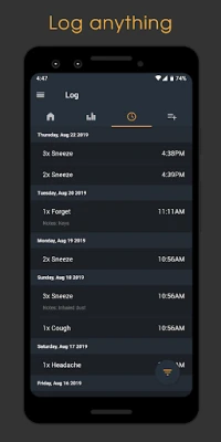 * Log - Create your own personal log of data by tracking anything from coughing to weight loss.