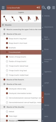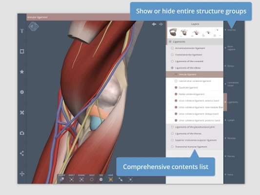 • The Contents folders arrange all 597 structures systemically, meaning you can browse by subcategory and switch all related structures on at once. It provides an excellent learning tool – for example turn on all branches of the brachial artery, or the ligaments of the elbow.